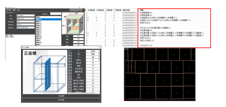 除了硬件設備之外,軟體技術自然也是恩德此次重點之一。恩德一向重視軟硬體的結合,不只要在硬件設備上的提升,軟體也要能輔佐生產效率提高。除了AGMVP以外,今天小編想特別介紹的是我們另一個軟體:WOOD CAM PLUS。WOOD CAM PLUS為參數式的拆料軟體,內建常見模組化的柜子,可以依據客戶需求輸入尺寸及數量,將所有訂單輸入之后,便會以大性能的方式排版,盡量減少廢材。原先需要人工來排版,但人為排版費時且不一定正確使用所有板材,拆料軟體的使用不只速度變快,更降低錯誤率。